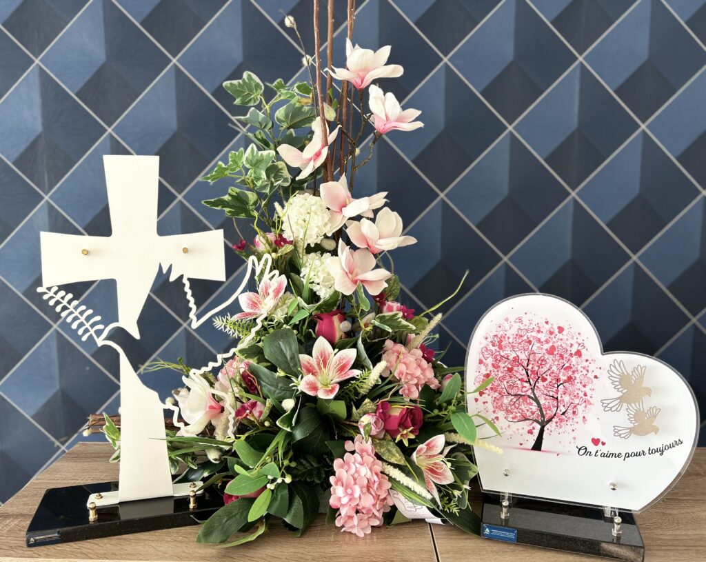 En plus de nos plaques funéraires et de nos fleurs artificielles, Pompes Funèbres des Cèdres vous propose en magasin de nombreux articles funéraires supplémentaires pour rendre hommage à vos proches de manière personnelle.
